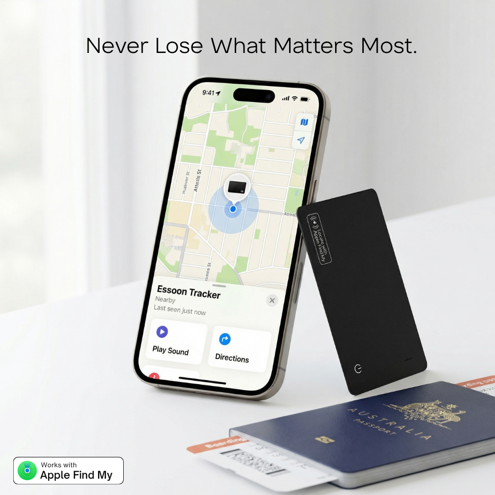 Slide Essoon into your child’s backpack as a silent safety net. Track items, not people — powered by Apple’s encrypted privacy framework.