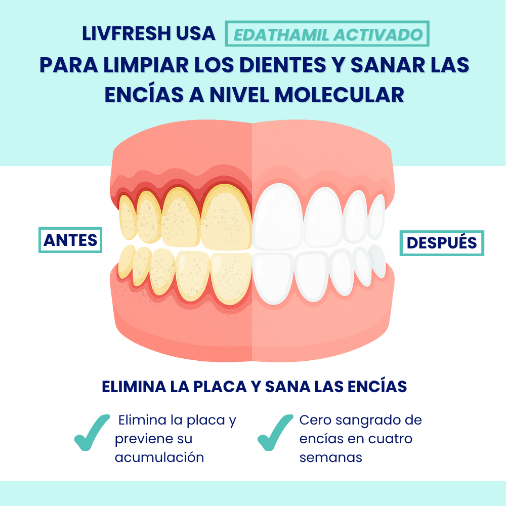 ¿Sabes cómo el jabón disuelve la grasa sin tallar? LIVFRESH hace lo mismo con la placa dental. Sin químicos que queman. Sin frotar agresivo. Solo cepilla normal y deja que la ciencia haga el trabajo. Nuestro Edathamil Activado elimina 250% más placa y mejora la salud de encías 190%. Es la diferencia entre tallar y disolver. En 14 días, el sangrado de encías desaparece . En 4 semanas, tu dentista preguntará qué cambiaste.
