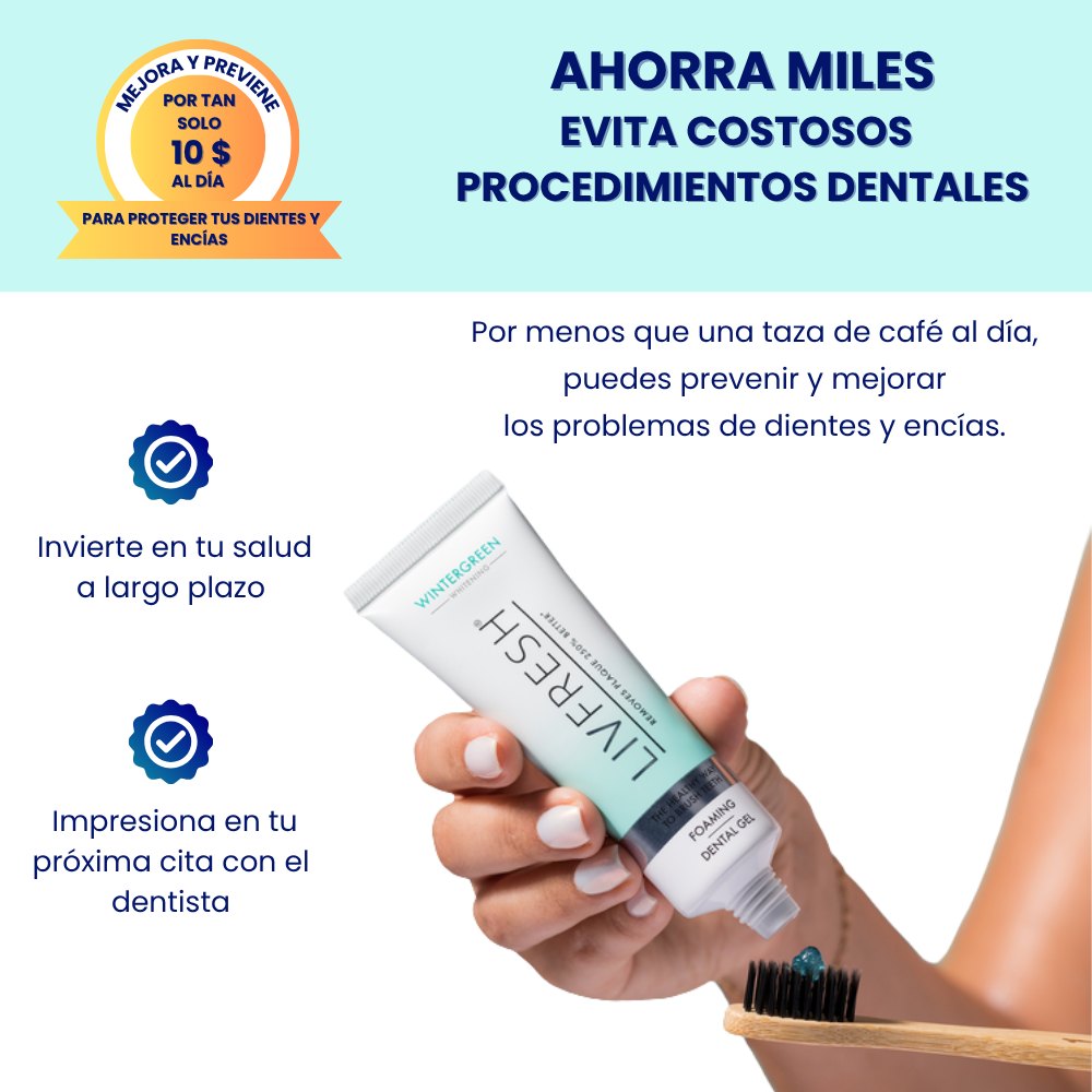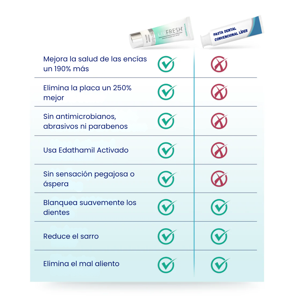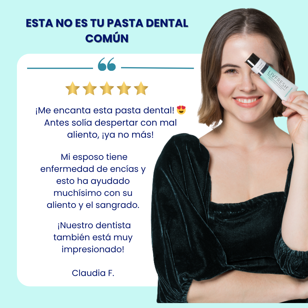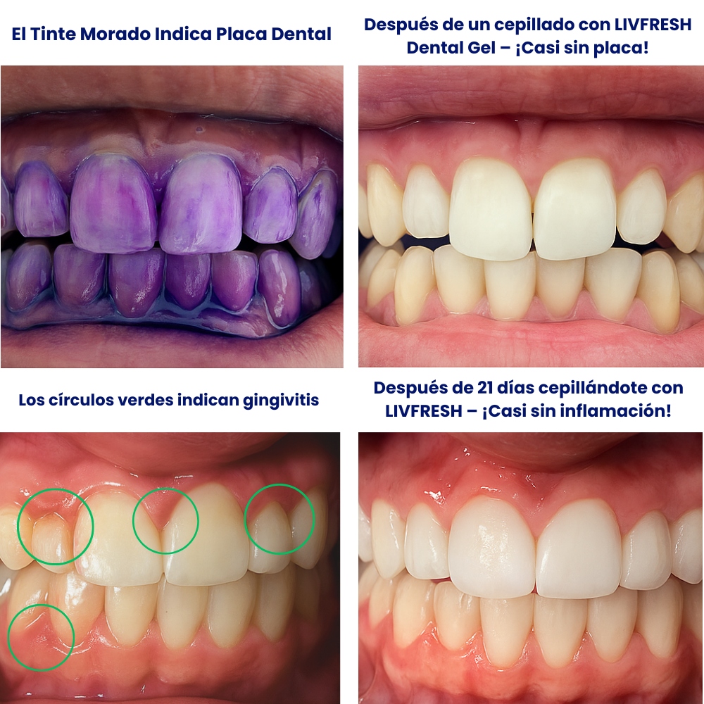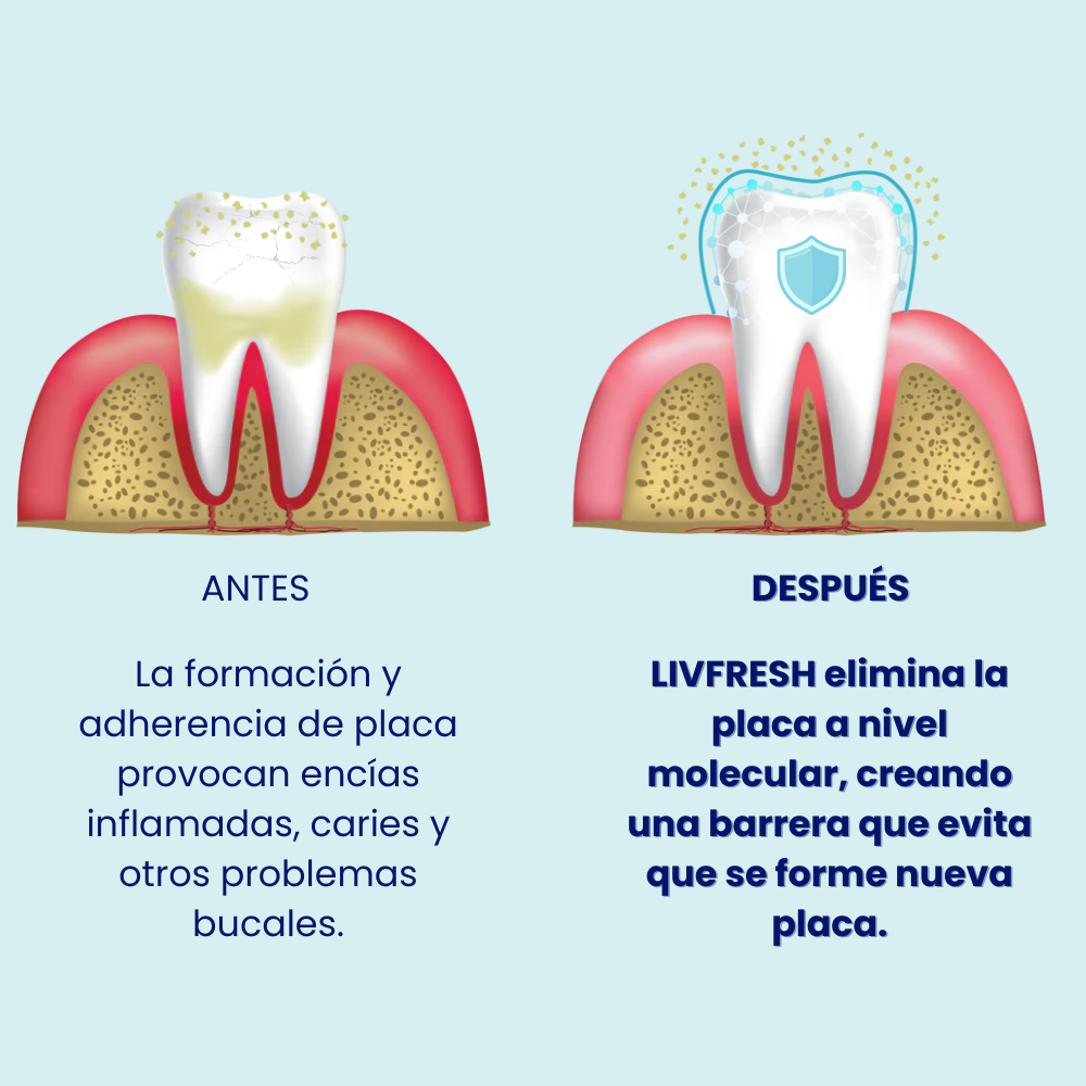 LIVFRESH no es una pasta más: es una fórmula revolucionaria con tecnología patentada que elimina la placa a nivel molecular y mejora la salud de tus encías desde el primer cepillado.