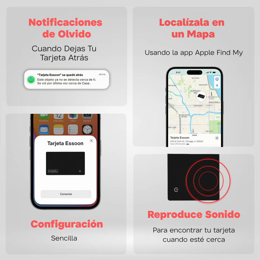 Actualmente, la Tarjeta de Rastreo Essoon está optimizada únicamente para usar con dispositivos Apple y con la aplicación Find My. Sin embargo, seguimos explorando oportunidades para ampliar la compatibilidad con otras plataformas en el futuro.